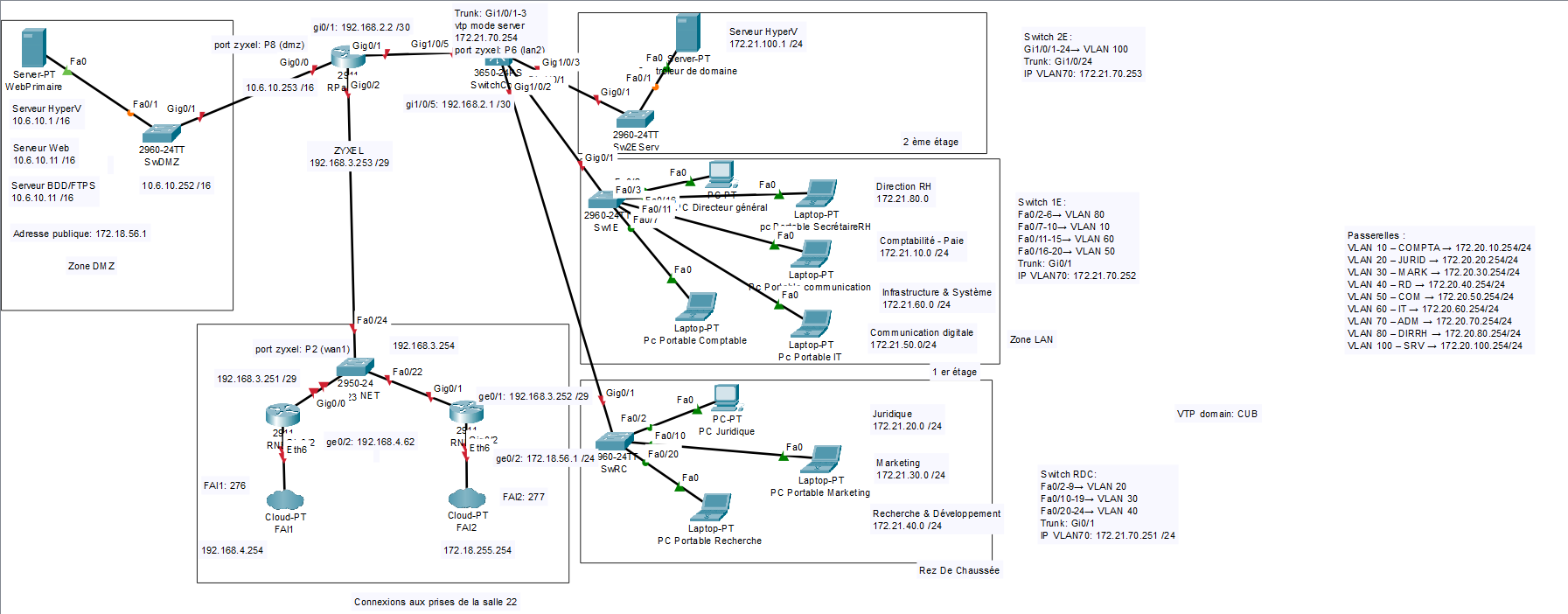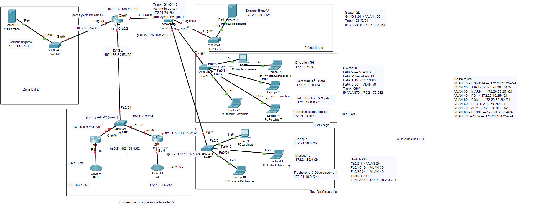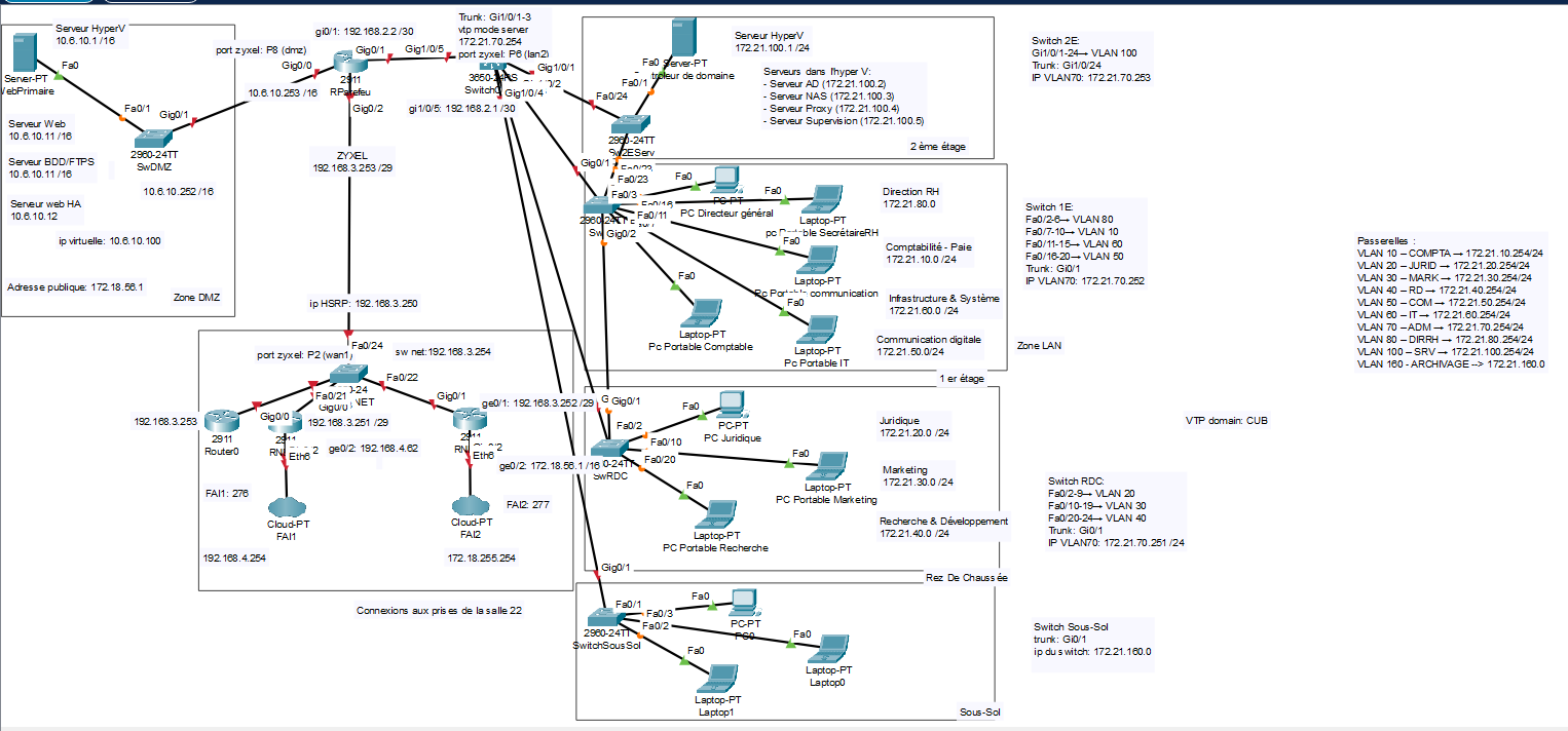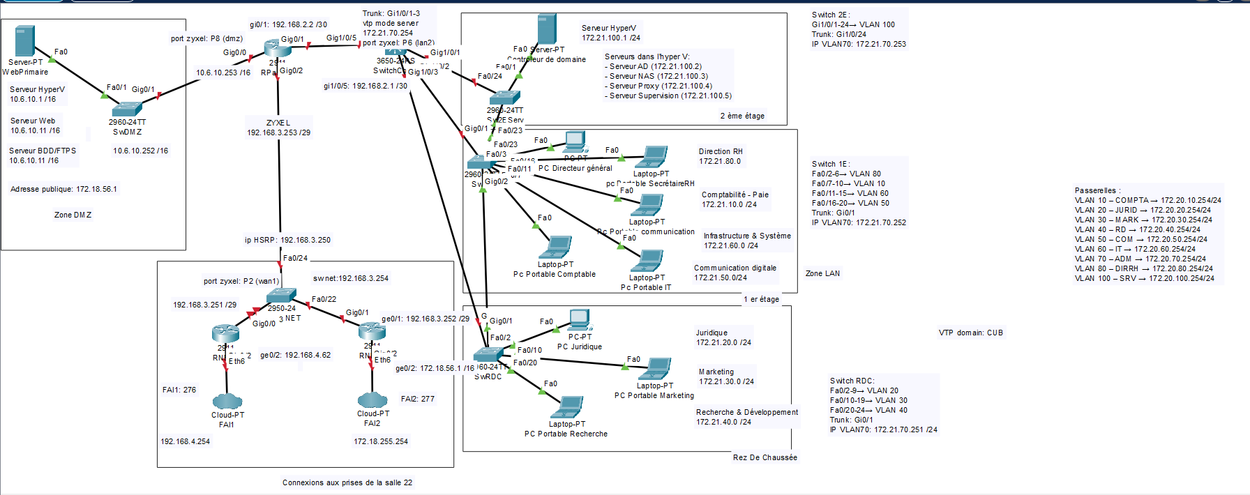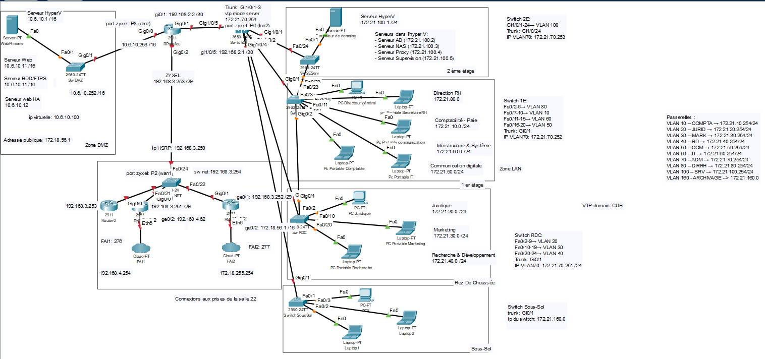 Vous trouverez ci-dessous l’ensemble de mon travail réalisé autour de la mise en place de la redondance réseau via HSRP : la documentation complète de la configuration, le rapport détaillé des tests de basculement ainsi que le schéma réseau final utilisé pour le déploiement.